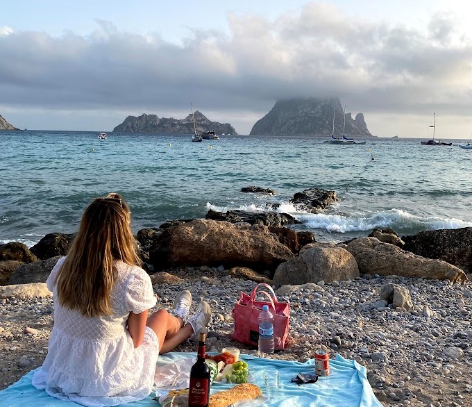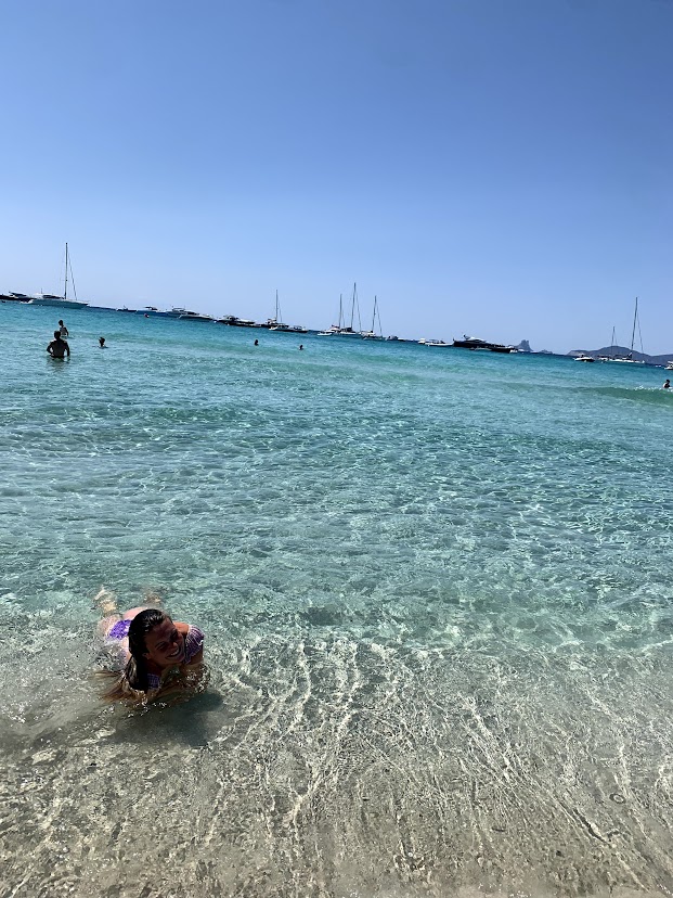 The following day we headed to Cala Conta for the day, a beach situated on the south side of Ibiza island, with beautiful turquoise waters and views of the little islands dotted near the coastline. The main beach area was packed, but if you continue walking over to the left, you will come across Cala Escondida. You need to climb down steps to get to this beach, but it should be quieter and has a cute Chiringuito.