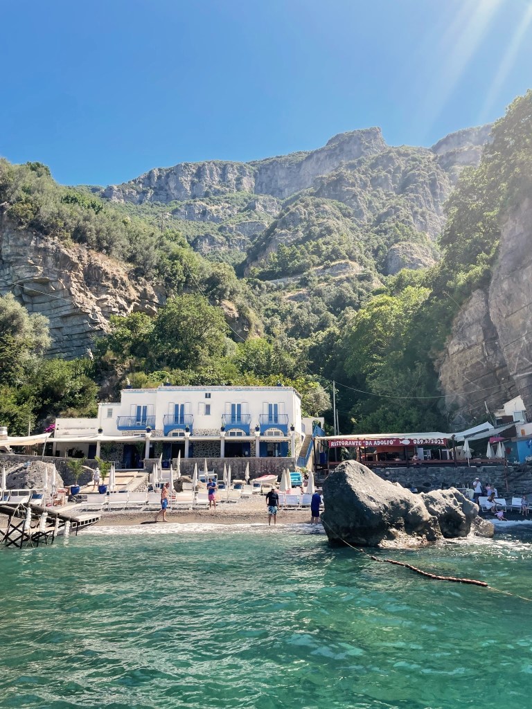 - Da Adolfo is a gorgeous restaurant with fresh delicious food, set on a tiny cove in Laurito. It proved difficult to get a booking at Da Adolfo as they don’t like to answer the phone, and in the end our Airbnb host sorted our booking, so if you’d like to go I’d recommend enquiring with your accommodation host. To get to Da Adolfo you take the boat with the red fish on top from Positano pier. I recommend going early and spending a few hours chilling and swimming on the cove before lunch. You can book sunbeds from Da Adolfo, but these were booked out the day we visited so we lay on the (tiny) public part of the beach. This was a big highlight of our trip to Amalfi Coast and will definitely be back.